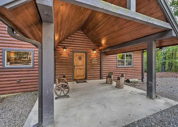 The 2-bedroom Creekside Broken Bow Cabin With Hot Tub And Fire Pit! Villa includes a car park and a patio with views of the lake.